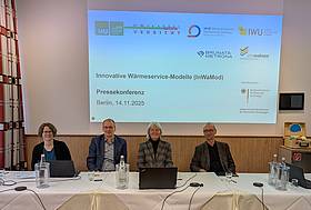 Auf der Pressekonferenz zum Abschluss des Projektes InWaMod (v.l.n.r.): Dr. Ina Renz (IWU), Dr. Andreas Enseling (IWU), Prof. Dr. Martina Deckert (Universität Kassel) und Prof. Dr. Bernhard Gill (LMU München). © Institut Wohnen und Umwelt, Ines Weber